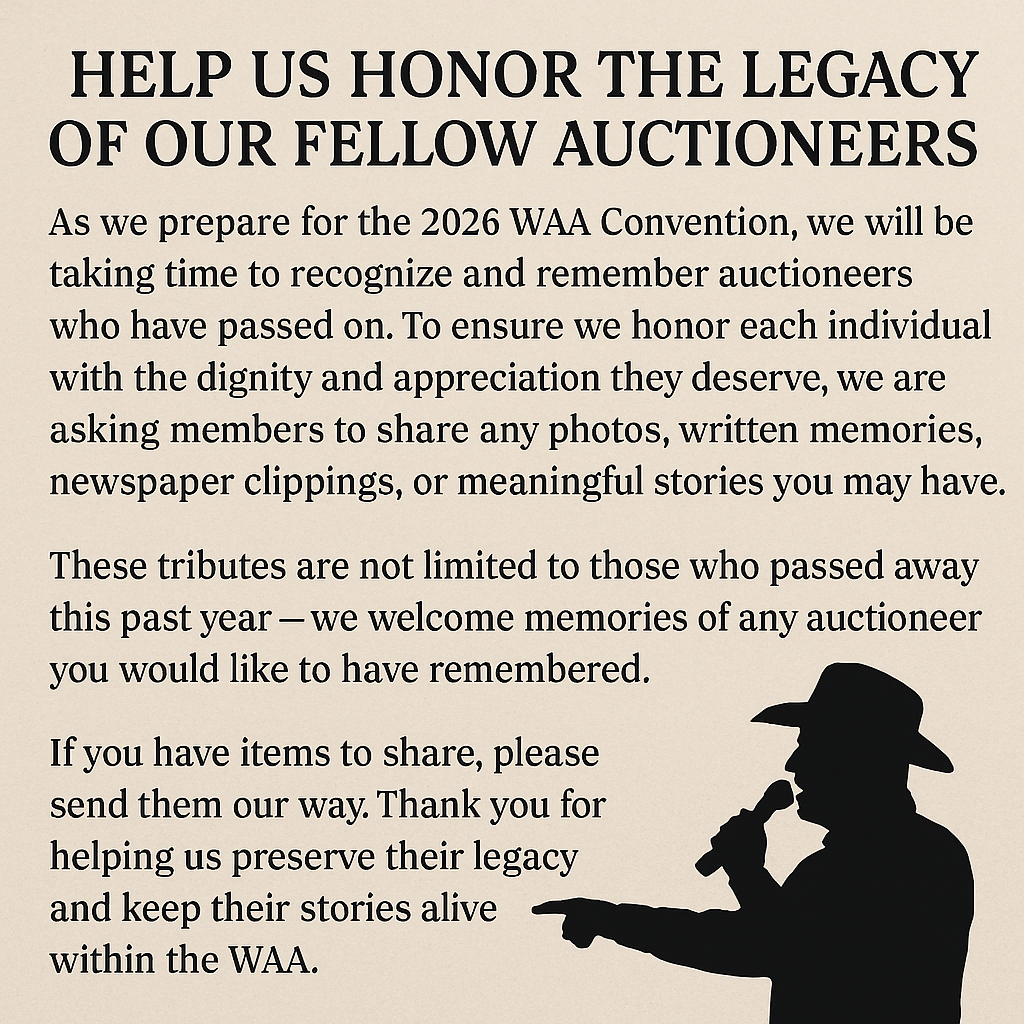 As we prepare for the 2026 WAA Convention, we will be taking time to recognize and remember auctioneers who have passed on. To ensure we honor each individual with the dignity and appreciation they deserve, we are asking members to share any photos, written...
